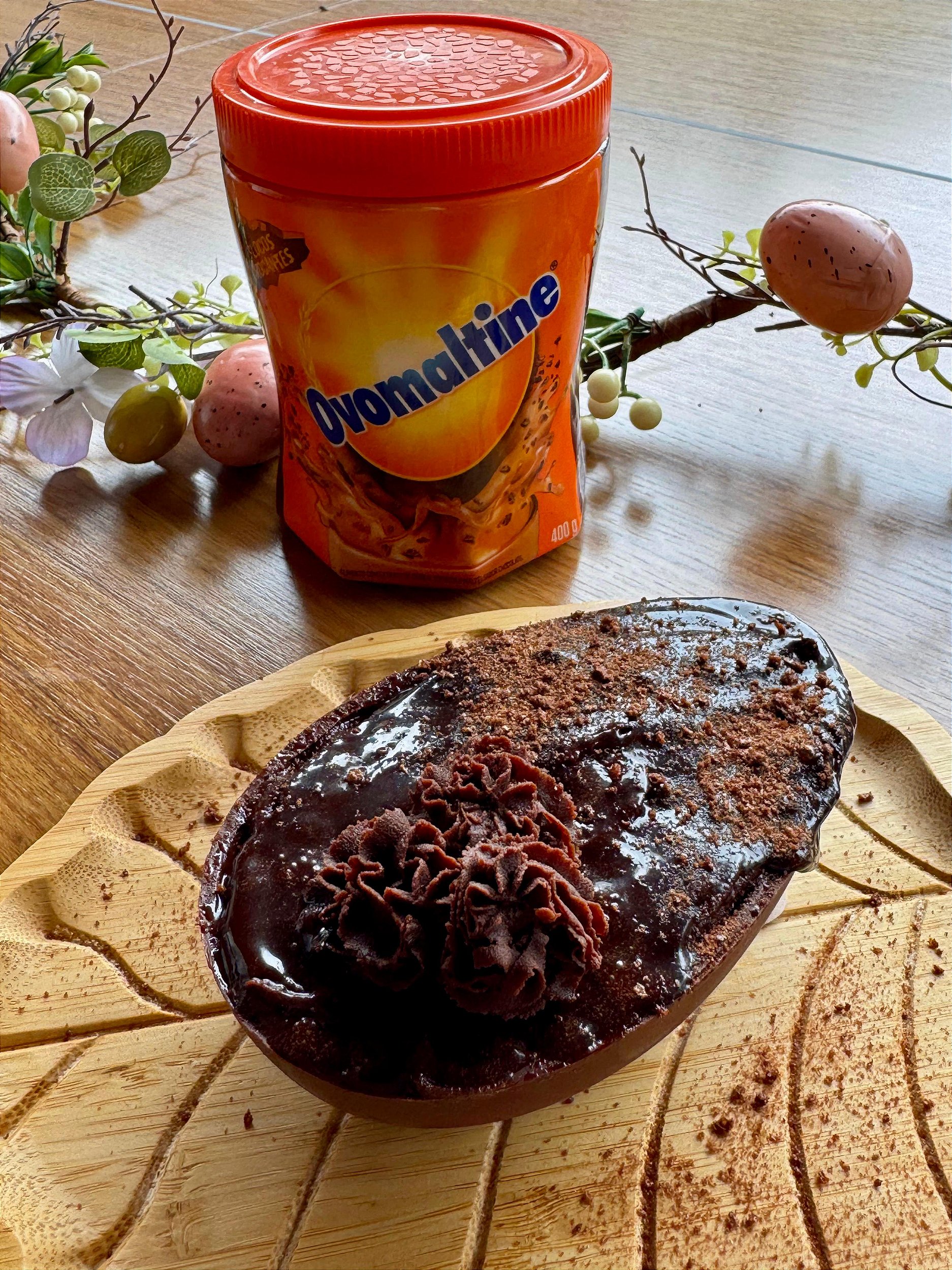 Ovo de chocolate ao leite de coco, com casca delicada e cremosa, recheado com camadas irresistíveis de creme amanteigado, ganache de Ovomaltine e pedaços de bolo de chocolate sem glúten. Uma combinação intensa, crocante e extremamente indulgente.