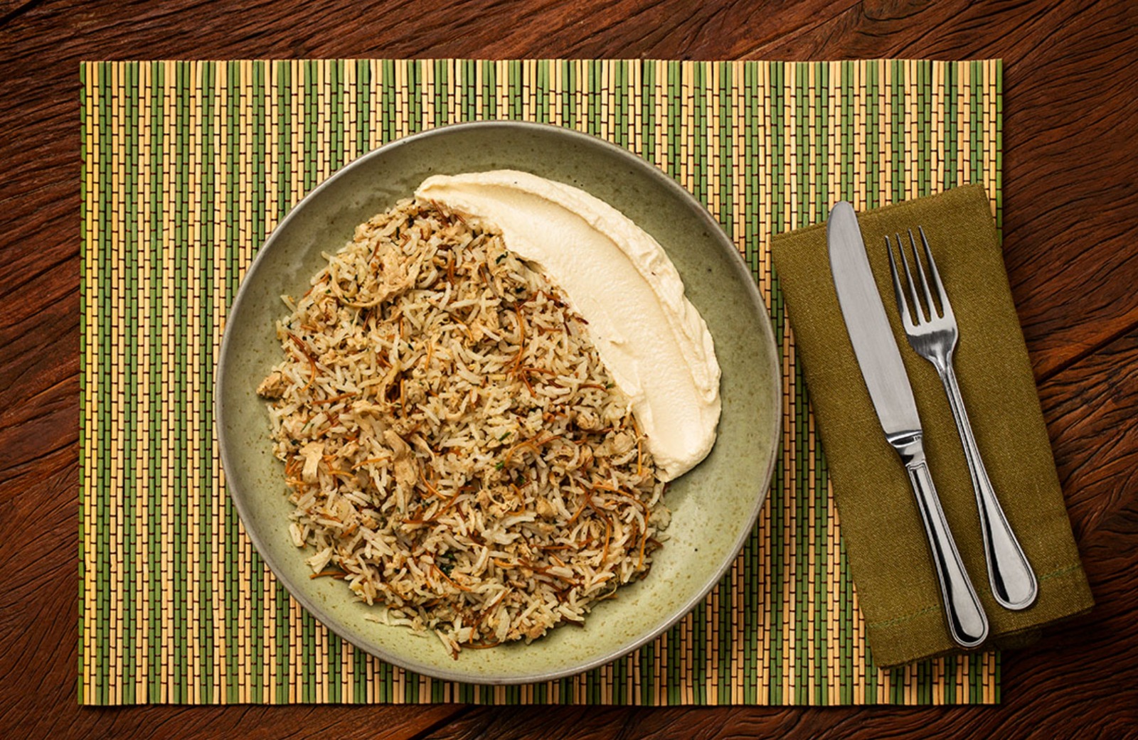 Uma deliciosa e aromática refeição que combina sabores autênticos e aromas tradicionais do Oriente Médio. Apresenta um hummus cremoso e envolvente, harmonizado com um arroz basmati soltinho preparado com especiarias e temperos típicos da culinária libanesa. Uma experiência leve, saborosa e cheia de nuances culturais, ideal para quem deseja explorar a riqueza dos sabores do Médio Oriente em uma refeição nutritiva e reconfortante.
